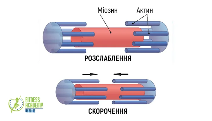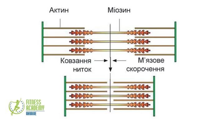 2. В структурах м’яза утворюються звʼязки міозину з актином (за наявності зміни концентрації Са), відбувається їх ковзання, що спричиняє скорочення мʼяза.
